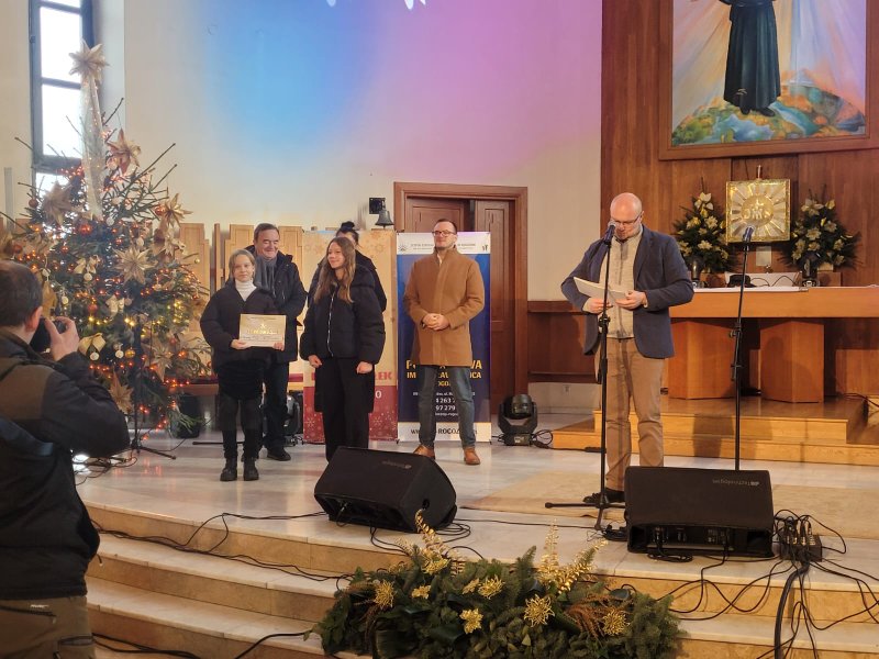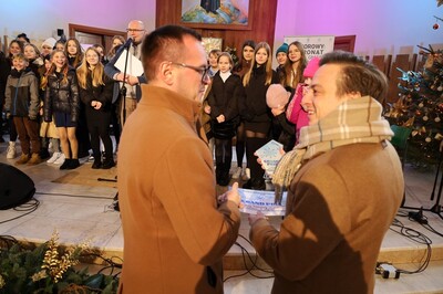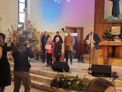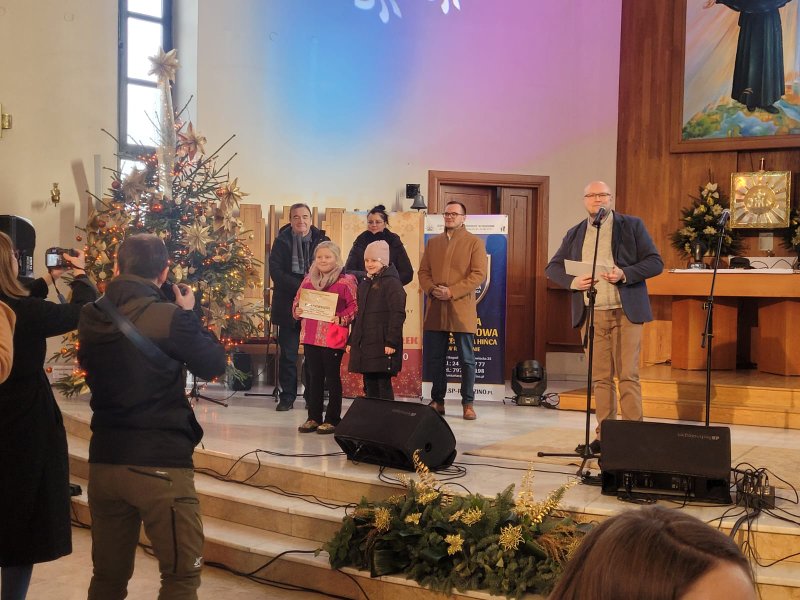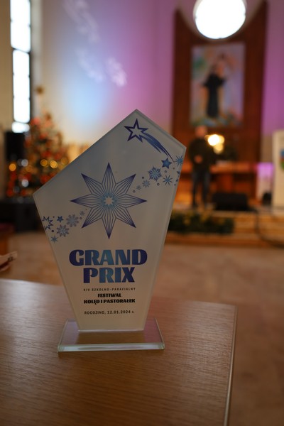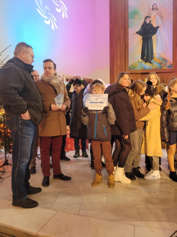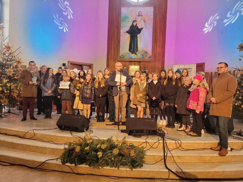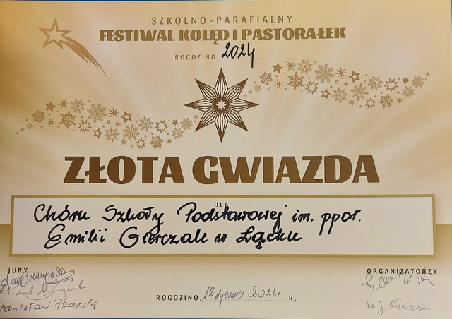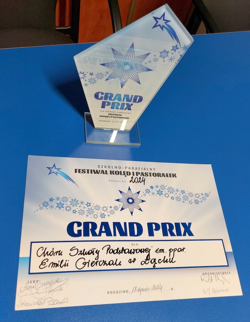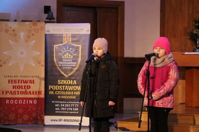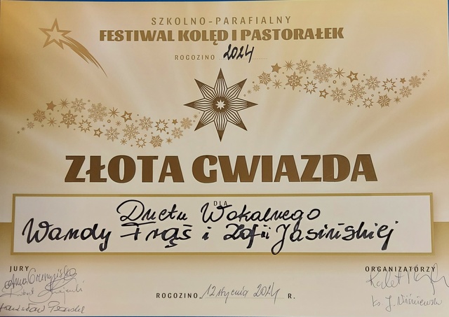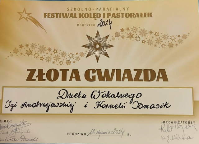 Miło nam poinformować, że w piątek 12 stycznia w kościele pw. Św. Faustyny w Rogozinie odbył się XIV Szkolno-Parafialny Festiwal Kolęd i Pastorałek, w którym wzięło udział ponad stu młodych artystów z powiatu płockiego i sierpeckiego, w tym nasz chór szkolny, w składzie: Miłosz Józwiak (4b), Maja Giętka, Oliwia Jędrzejczak, Zuzanna Jędrzejczak, Klaudia Koronowska, Julia Skierska, Aleksandra Tyrajska (5b), Antoni Donakowski, Piotr Falkowski, Lena Kamińska, Dawid Królikowski, Gabriel Łyziński, Julian Pawlak, Julia Zielińska (5c), Marcelina Kowalska, Amelia Sikorska (7a), Alicja Falkowska, Alicja Gocała, Szymon Józwiak, Gabriela Kamińska, Gabriela Pawlikowska, Adrianna Rutkowska, Emilia Tomczak (7b), Marianna Pawlikowska (7c), który z "Pastorałką od serca do ucha" przy akompaniamencie skrzypiec (Milena Jędrzejewska z 7c) okazał się najlepszym wykonawcą przeglądu i zdobył Grand Prix. Złotą Gwiazdę w swoich kategoriach zdobyły także wyodrębnione duety wokalne: Kornelia Tomasik (2b) i Iga Andrzejewska (2c) z pastorałką "Zaśnij Dziecino" oraz Zofia Jasińska (5b) i Wanda Frąś (7a) z "Kolęda Maryi".