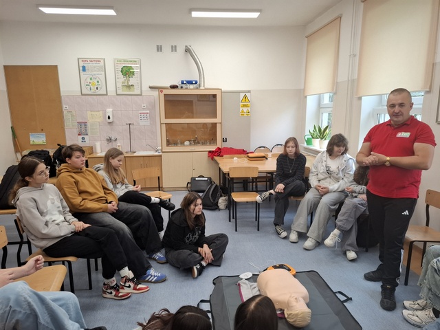 W dniu 30.10.2025 r. odbyło się szkolenie dla uczniów klasy VII b z zakresu pierwszej pomocy przedmedycznej prowadzone przez pana Jarosława Klimka.