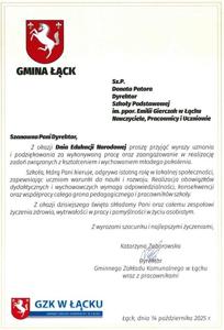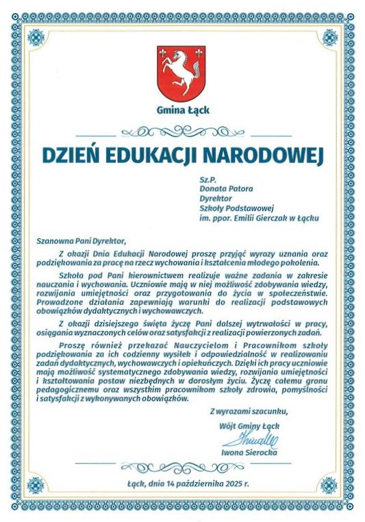 Dziękujemy za obecność dostojnym Gościom: Pani Iwonie Sierockiej Wójtowi Gminy Łąck, Pani Agnieszce Woźniak Zastępcy Wójta, Pani Annie Śnieć Przewodniczącej Rady Gminy Łąck, Radnym Gminy - Panu Ireneuszowi Ignaczakowi, Paniom Katarzynie Lewandowskiej, Magdalenie Lewandowskiej, Joannie Piegat, Katarzynie Sobczak, Kierownictwu Gminnych Jednostek Organizacyjnych i Referatów Urzędu Gminy Łąck -  Pani Izabeli Olenderek - Skarbnikowi Gminy Łąck, Pani Dyrektor Gminnego Zakładu Komunalnego Katarzynie Zaborowskiej, Pani Dyrektor Gminnej Biblioteki Publicznej w Łącku Joannie Foch, Dyrektorowi CKSiR Tomaszowi Nowackiemu, Paniom Dyrektor przedszkoli w Łącku i Podlasiu - Anecie Kołodziejskiej i Katarzynie Mikołajczyk, Przedstawicielkom Gminnej Komisji Rozwiązywania Problemów Alkoholowych - Paniom Aleksandrze Żaglewskiej i Elwirze Kopeć, Zarządowi Rady Rodziców - Paniom Aleksandrze Rutkowskiej i Wioletcie Hickey,