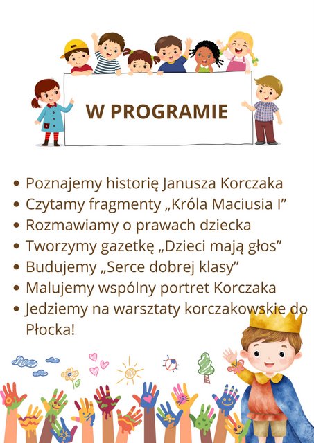 W ramach projektu uczniowie poznawali historię życia Janusza Korczaka, słuchali fragmentów książki „Król Maciuś I”, oglądali materiały edukacyjne oraz rozmawiali o prawach dziecka. W świetlicy powstała gazetka „Dzieci mają głos”, a nasi podopieczni aktywnie uczestniczyli w działaniach plastycznych i integracyjnych.